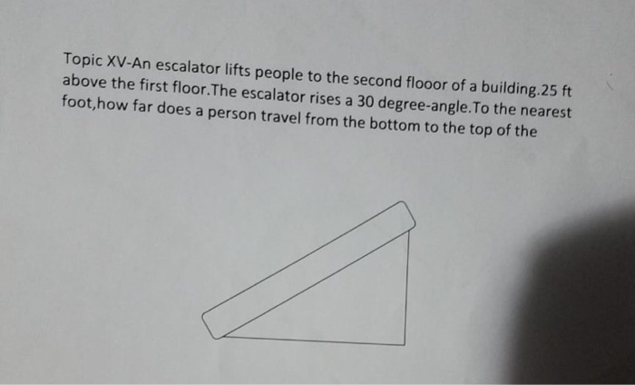 The height from the first floor to second floor is called the adjacent while the travelled distance of the people is called the hypothenuse. The huge difference of elevator and escalator is that the latter has a step chain. Floors a world we now move around in as a matter of course. You have a right triangle with side opposite the 30 degree angle being length 25 ft.