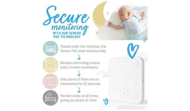 Angelcare ac1300 baby breathing movement monitor with 3 5 display and wired sensor pad. In addition to night vision two way talk plus pan tilt and zoom camera functions this brand s sensor mat baby monitor design allows you to place a sensor mat under your baby s mattress and an alarm will sound if there s been no movement after 20 seconds. The angelcare baby monitor is a personal care product. Please consult angelcare if unsure of warnings and safety mattress compatibility instructions battery specific 39.